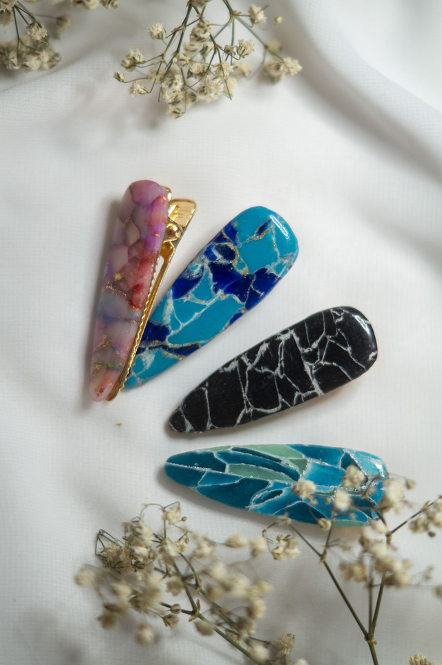La pièce de polymère est assemblée sur une pince crocodile permettant un parfait maintient dans les cheveux, qu’ils soient fins ou épais