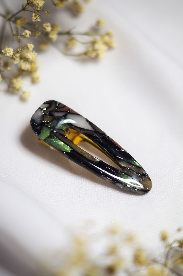 La pièce de polymère est assemblée sur une pince crocodile permettant un parfait maintient dans les cheveux, qu’ils soient fins ou épais